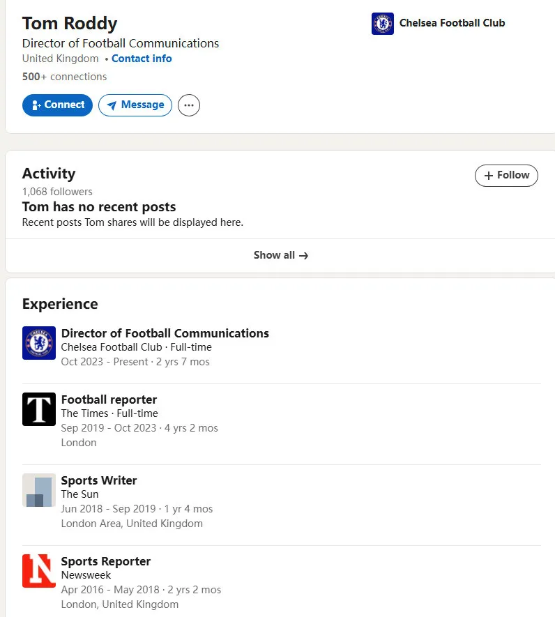 与他近乎同时被切尔西官方“收编“的,正是前泰晤士报著名记者Tom Roddy,他本人也是泰晤士报最后一个正式的,从头至尾较为专注于切尔西的跟队记者。