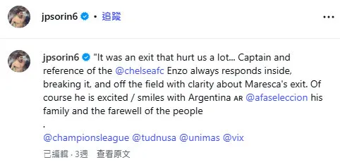 在罗塞尼尔的赛前发布会上,他明确提及了和恩佐的对话,并将ESPN的这次采访归结于西转英的错译,赛后的情绪。